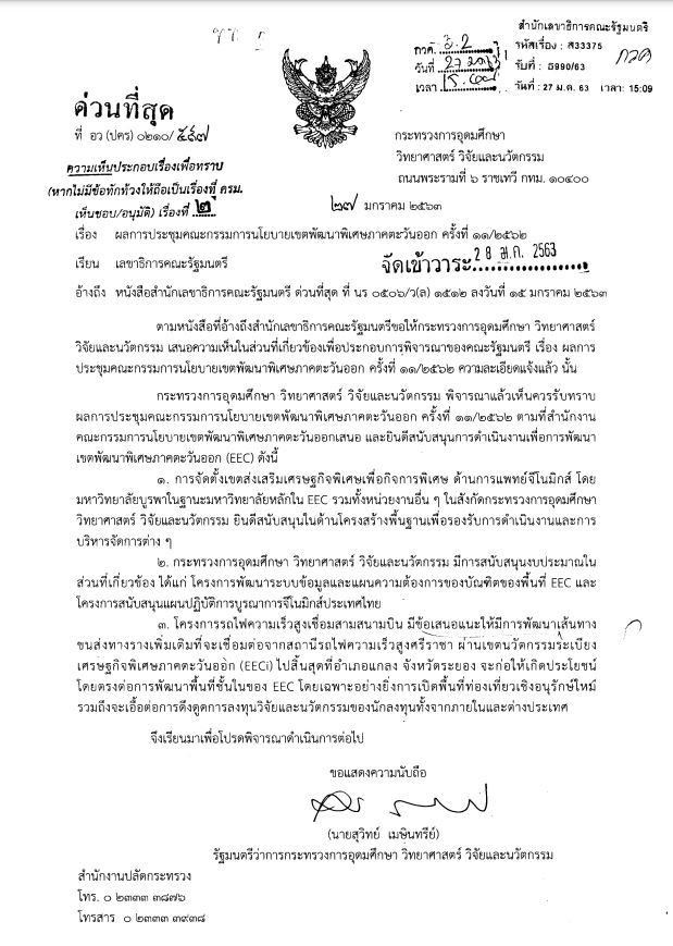 กระทรวงการอุดมศึกษา วิทยาศาสตร์ วิจัยและนวัตกรรม พิจารณารับทราบผลการประชุมคณะกรรมการนโยบายเขตพัฒนาพิเศษภาคตะวันออก ครั้งที่ 11/2562 ตามที่สำนักงานคณะกรรมการนโยบายเขตพัฒนาพิเศษภาคตะวันออกเสนอ และยินดีสนับสนุนการคำเนินงานเพื่อการพัฒนาเขตพัฒนาพิเศษภาคตะวันออก (EEC) ดังนี้ 1. การจัดตั้งเขตส่งเสริมเศรษฐกิจพิเศษเพื่อกิจการพิเศษ ด้านการแพทย์จีโนมิกส์ โดยมหาวิทยาลัยบูรพาในฐานะมหาวิทยาลัยหลักใน EEC รวมทั้งหน่วยงานอื่น 1 ในสังกัดกระทรวงการอุดมศึกษา วิทยาศาสตร์ วิจัยและนวัตกรรม ยินดีสนับสนุนในด้านโครงสร้างพื้นฐานเพื่อรองรับการดำเนินงานและการบริหารจัดการต่าง ๆ 2. กระทรวงการอุดมศึกษา วิทยาศาสตร์ วิจัยและนวัตกรรม มีการสนับสนุนงบประมาณในส่วนที่เกี่ยวข้อง ได้แก่ โครงการพัฒนาระบบข้อมูลและแผนความต้องการของบัณฑิตของพื้นที่ EEC และโครงการสนับสนุนแผนปฏิบัติการบูรณาการจีในมิกส์ประเทศไทย 3. โครงการรถไฟความเร็วสูงเชื่อมส ามสนามบิน มีข้อเสนอแนะให้มีการพัฒนาเส้นทางขนส่งทางรางเพิ่มเติมที่จะเชื่อมต่อจากสถานีรถไฟความเร็วสูงศรีราชา ผ่านเขตนวัดกรรมระเบียงเศรษฐกิจพิเศษภาคตะวันออก (EEC) ไปสิ้นสุดที่อำเภอแกลง จังหวัดระยอง จะก่อให้เกิดประโยชน์โดยตรงต่อการพัฒนาพื้นที่ชั้นในของ EEC โดยเฉพาะอย่างยิ่งการเปิดพื้นที่ท่องเที่ยวเชิงอนุรักษ์ใหม่รวมถึงจะเอื้อต่อการดึงดูดการลงทุนวิจัยและนวัตกรรมของนักลงทุนทั้งจากภายในและต่างประเทศ -
