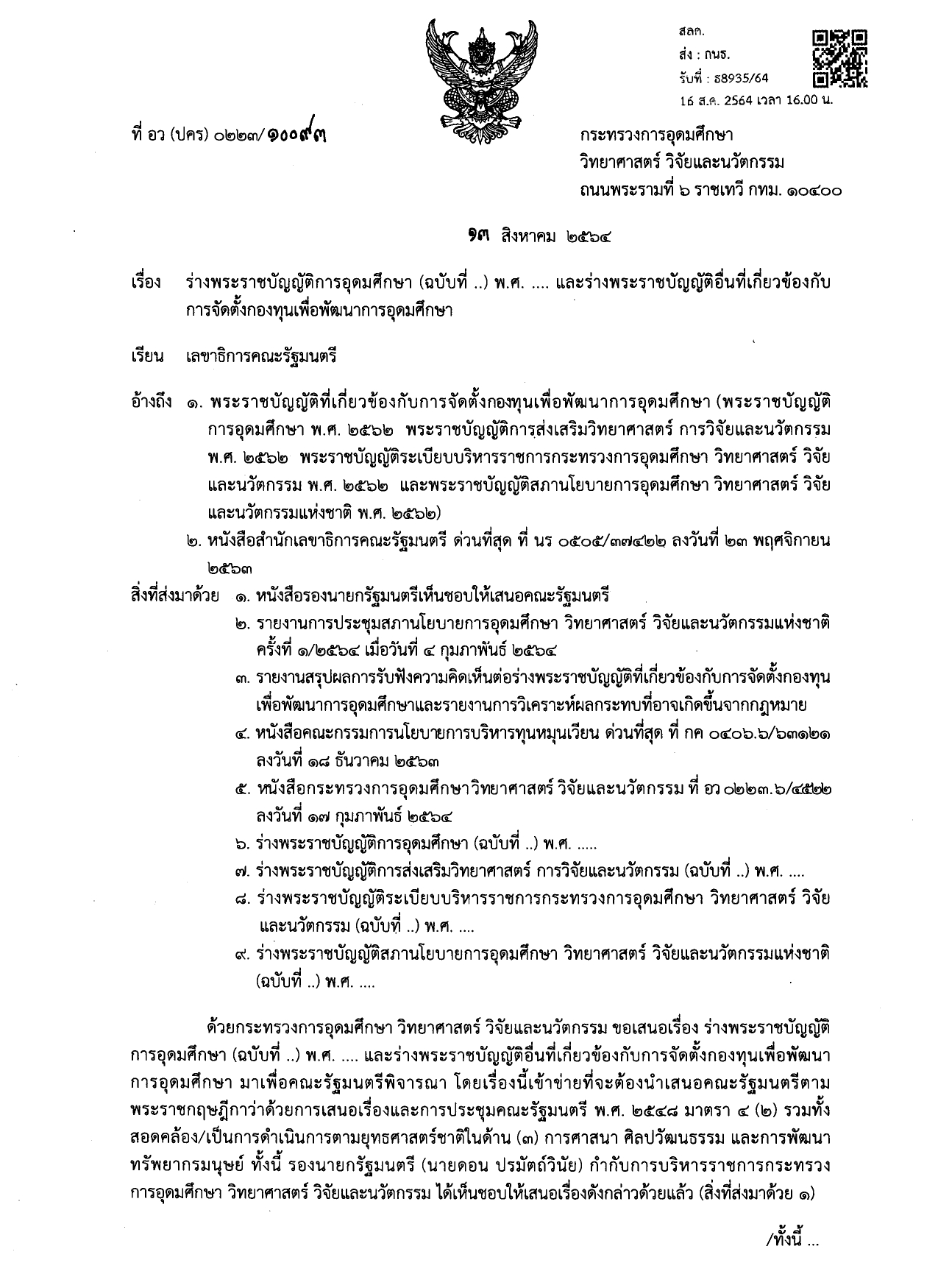 คณะรัฐมนตรีมีมติ ดังนี้ 1. อนุมัติหลักการ 1.1 ร่างพระราชบัญญัติการอุดมศึกษา (ฉบับที่ ..) พ.ศ. .... 1.2 ร่างพระราชบัญญัติการส่งเสริมวิทยาศาสตร์ การวิจัยและนวัตกรรม (ฉบับที่ ..) พ.ศ. .... 1.3 ร่างพระราชบัญญัติระเบียบบริหารราชการกระทรวงการอุดมศึกษา วิทยาศาสตร์ วิจัยและนวัตกรรม (ฉบับที่ ..) พ.ศ. .... 1.4 ร่างพระราชบัญญัติสภานโยบายการอุดมศึกษา วิทยาศาสตร์ การวิจัยและนวัตกรรม (ฉบับที่ ..) พ.ศ. .... -