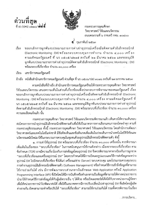กระทรวงการอุดมศึกชา วิทยาศาสตร์ วิจัยและนวัตกรรมพิจารณาให้ความเห็นชอบต่อโครงการอุปกรณ์อิเล็กทรอนิกส์ติดตามตัวเพื่อใช้เป็นมาตรการทางเลือกแทนการลงโทษจำคุก ตามที่กระทรวงยุติธรรมเสนอ ทั้งนี้ กระทรวงการอุดมศึกษา วิทยาศาสตร์ วิจัยและนวัตกรรม โดยสำนักงานพัฒนาวิทยาศาสตร์และเทคโนโลยีแห่งชาติ มีข้อคิดเห็นและข้อสังเกตเพิ่มเติมในประเต็นการนำเทคโนโลยีดิจิทัลและนวัตกรรมสมัยใหม่มาใช้ในกระบวนการควบคุมในชุมชนด้วยอุปกรณ์อิเล็กทรอนิกส์ติดตามตัว ดังนี้ 1. การเช่าใช้อุปกรณ์ EM พร้อมระบบที่เกี่ยวข้อง จำนวน 30,000 เครื่องนั้น ควรพิจารณา เพิ่มเติมในเรื่องของ "ระบบที่เกี่ยวข้อง" ในการสนับสนุนการใช้งานตังกล่าว เนื่องจากระบบที่เกี่ยวข้อง ตามข้อกำหนด (TOR) อาจมีความเกี่ยวโยงกับการส่งข้อมูลโดยอุปกรณ์ EM จึงควรพิจารณาหาทางป้องกันการผูกขาด"ระบบที่เกี่ยวข้องและเครื่องอุปกรณ์ EM" โคยควรกำหนดให้มีการเปิดเผยรูปแบบและวิธีการส่งข้อมูลระหว่างอุปกรณ์ EM ไปยังระบบที่เกี่ยวข้อง ซึ่งได้แก่ เครื่องแม่ช่าย (Server) ระบบควบคุม และโปรแกรมควบคุมระบบการทำงานอุปกรณ์อิเล็กทรอนิกส์ติดตามตัว (Software Management) หรือกำหนดวิธีการเข้าถึงข้อมูลที่สามารถใช้งานร่วมกันได้ เช่น มีการพัฒนาระบบส่วนกลางในลักษณะ Web Application หรือมี Application Programming Interface (AP1) ที่เปิดโดยให้มีการบันทึกหรือทำเอกสารเป็นข้อมูลที่สามารถให้ทางหน่วยราชการนำมาใช้กำหนดวิธีการส่งข้อมูลให้กับผู้ผลิตรายอื่น ๆ ได้ด้วย หรือเปิดเผยชอร์สโค้ดให้กับทางหน่วยงานผู้จัดหา เพื่อให้หน่วยราชการนำไปพัฒนาต่อไต้ เพื่อให้ในอนาคตหากมีการปรับเปลี่ยนไปเช่าอุปกรณ์ EM ที่ผลิตโดยผู้ผลิตต่างรายกัน ยังคงสามารถทำหรือปรับให้ "ระบบที่เกี่ยวข้อง" สามารถใช้งานร่วมกันได้ รวมทั้งควรพิจารณาในเรื่องการบริหารความต่อเนื่องของการใช้งานอุปกรณ์และลดปัญหาการผูกชาดซองผู้ผลิตเพียงรายเดียว และก่อให้เกิดการแข่งชันในเรื่องราคาจากผู้ผลิตหลายรายได้ รวมถึงส่วนของโปรแกรมที่มีการเข้าหรือถอดรหัสข้อมูลที่ส่งมาจากอุปกรณ์ EM ควรมีมาตรฐานหรือข้อกำหนดที่ชัดเจนที่สามารถใช้ร่วมกันหรือปรับใช้ใด้ และควรพิจารณาการคำนึงถึงการดูแลข้อมูลส่วนบุคคล (Data Pirvacy) และการรักษาความปลอดภัยของข้อมูล (Security) และการดูแลข้อมูลที่จัดเก็บในระบบคลาวน์ของผู้ให้บริการให้เป็นไปตามมาตรฐานด้วย 2. สำหรับข้อเสนอโครงการจัดหาระบบคอมพิวเตอร์ของรัฐที่มีมูลค่าเกินกว่า 100 ล้านบาทขึ้นไปโครงการการนำอุปกรณ์อิเล็กทรนิกส์ติตตามตัวมาใช้เพื่อเป็นมาตรการทางเลือกแทนการสงโ