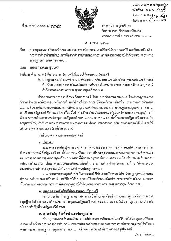 ร่างกฎกระทรวงกำหนดคุณสมบัติ ลักษณะต้องห้าม การแต่งตั้ง การพ้นจากตำแหน่งของประธานกรรมการและกรรมการผู้ทรงคุณวุฒิ และการทำบัญชีสำรองเพื่อเลื่อนขึ้นมาดำรงตำแหน่งแทนกรรมการผู้ทรงคุณวุฒิที่พ้นจากตำแหน่งก่อนครบวาระในคณะกรรมการมาตรฐานการอุดมศึกษา พ.ศ.. เข้าข่ายที่จะต้องนำเสนอคณะรัฐมนตรีตามพระราชกฤษฎีกาว่าด้วยการเสนอเรื่องและการประชุมคณะรัฐมนตรี พ.ศ. 2548 มาตรา 4 (5) ร่างกฎกระทรวงเกี่ยวกับนโยบายสำคัญที่คณะรัฐมนตรีกำหนด 1. กำหนดคุณสมบัติและลักษณะต้องห้ามของประธานกรรมการ และกรรมการผู้ทรงคุณวุฒิในคณะกรรมการมาตรฐานการอุดมศึกษา 2. กำหนดการแต่งตั้ง วาระการดำรงตำแหน่งของประธานกรรมกรร และกรรมการผู้ทรงคุณวุฒิในคณะกรรมการมาตรฐานการอุดมศึกษาคราวละสี่ปี และอาจได้รับการแต่งตั้งใหม่อีกได้ แต่ไม่เกินสองวาระติดต่อกัน 3. กำหนดเหตุแห่งการพ้นจากตำแหน่งของประธานกรรมการ และกรรมการผู้ทรงคุณวุฒิในคณะกรรมการมาตรฐานการอุดมศึกษา 4. กำหนดวิธีการได้มาซึ่งประธานกรรมการและกรรมการผู้ทรงคุณวุฒิในคณะกรรมการมาตรฐานการอุดมศึกษา โดยให้คณะกรรมการการอุดมศึกษามีหน้าที่ในการเสนอชื่อผู้สมควรได้รับการแต่งตั้งเป็นประธานกรรมการและกรรมการผู้ทรงคุณวุฒิต่อรัฐมนตรี 5. กำหนดการจัดทำบัญชีสำรองเพื่อการเลื่อนขึ้นมาดำรงตำแหน่งแทนกรรมการผู้ทรงคุณวุฒิที่พ้นจากตำแหน่งก่อนครบวาระในคณะกรรมการมาตรฐานการอุดมศึกษา