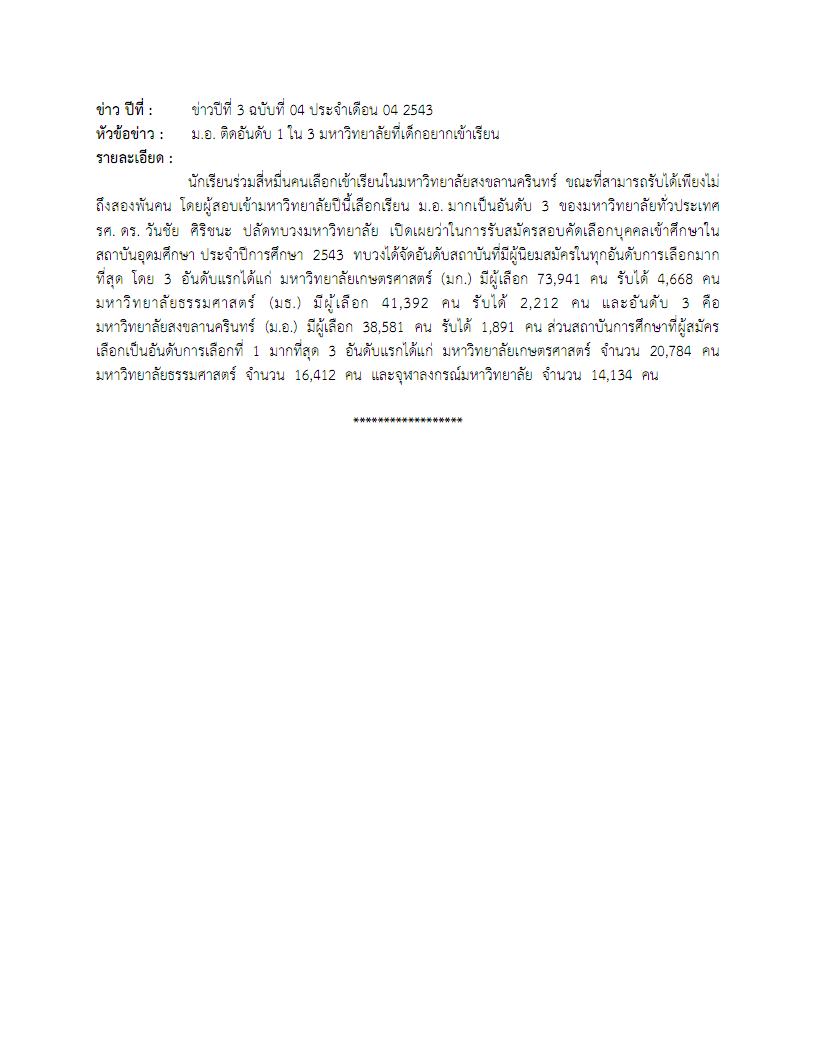 ข่าวปีที่ 3 ฉบับที่ 04 ประจำเดือน 04 พ.ศ. 2543 เกี่ยวกับม.อ. ติดอันดับ 1 ใน 3 มหาวิทยาลัยที่เด็กอยากเข้าเรียน โดยประจำปีการศึกษา 2543 ทบวงได้จัดอันดับสถาบันที่มีผู้นิยมสมัครในทุกอันดับการเลือกมากที่สุด โดย 3 อันดับแรกได้แก่ มหาวิทยาลัยเกษตรศาสตร์ (มก.) มีผู้เลือก 73,941 คน รับได้ 4,668 คน มหาวิทยาลัยธรรมศาสตร์ (มธ.) มีผู้เลือก 41,392 คน รับได้ 2,212 คน และอันดับ 3 คือมหาวิทยาลัยสงขลานครินทร์ (ม.อ.) มีผู้เลือก 38,581 คน รับได้ 1,891 คน -