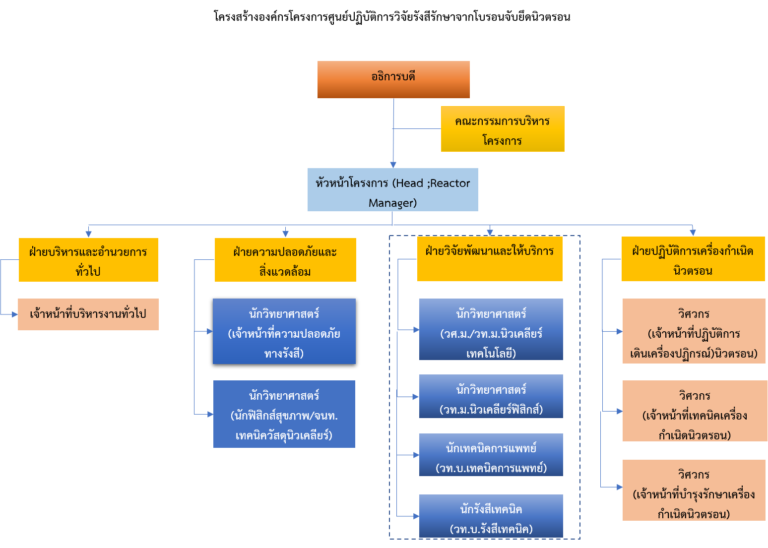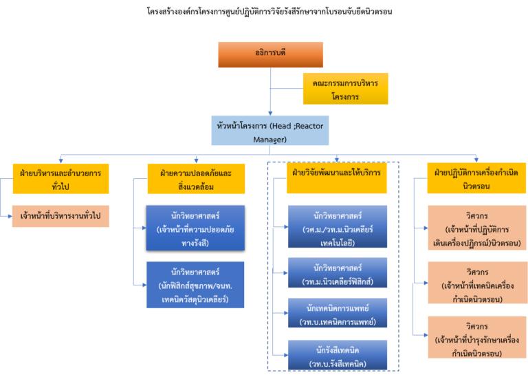 - แผนผังโครงสร้างองค์กรและการบริหาร โครงการจัดตั้งศูนย์ปฏิบัติการวิจัยรังสีรักษาจากโบรอนจับยึดนิวตรอน (ศวบน.)