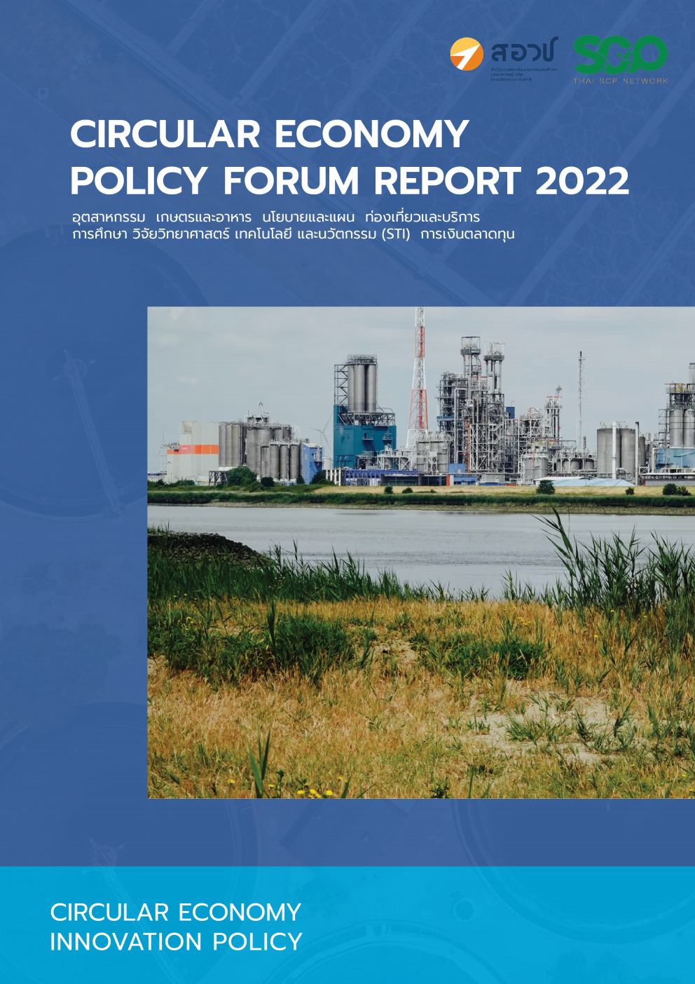 - รายงาน Circular Economy Policy Forum Report 2022 เป็นการรวบรวมและประมวลข้อมูลเศรษฐกิจหมุนเวียนที่ได้จากการประชุมหารือภายใต้โครงการบูรณาการและขับเคลื่อนภาคส่วนของไทยสู่ระบบเศรษฐกิจหมุนเวียนหรือโครงการ Circular Economy Innonvation Policy Forum ภายใต้ข้อตกลงบันทึกความร่วมมือ (ระยะเวลา 5 ปี มีนาคม พ.ศ. 2564 ถึง มีนาคม พ.ศ. 2567) “โครงการพัฒนาแนวทางการขับเคลื่อนเศรษฐกิจหมุนเวียน” ระหว่างสำนักงานสภานโยบายการอุดมศึกษา วิทยาศาสตร์ วิจัยและนวัตกรรมแห่งชาติ (สอวช.) กับ สมาคมส่งเสริมการผลิตและการบริโภคที่ยั่งยืน (ประเทศไทย) กิจกรรม โครงการฯ เริ่มดำเนิน ตั้งแต่เดือนมิถุนายน ถึงเดือนธันวาคม พ.ศ. 2564 มีวัตถุประสงค์หลักเพื่อมุ่งเน้นการพัฒนา Circular Economy Innovation Forum ให้เป็นเวทีแลกเปลี่ยนเรียนรู้ และระดมความคิดเห็นให้เกิดการตั้งประเด็น (Agenda) เพื่อระดมความคิดในการเสนอแนะเชิงนโยบายในการบูรณาการและขับเคลื่อนภาคส่วนของไทยสู่ระบบเศรษฐกิจหมุนเวียน และพัฒนาข้อเสนอแนะเชิงนโยบายเพื่อขับเคลื่อนเศรษฐกิจหมุนเวียน โดยกิจกรรมหลักของโครงการฯ นี้เป็น การสร้างพื้นที่หารือโดยการจัดประชุมกลุ่มรายสาขาประมาณ 3 ครั้ง ทั้ง 7 กลุ่มรายสาขา ได้แก่ กลุ่มอุตสาหกรรม กลุ่มเกษตรและอาหาร กลุ่มท่องเที่ยวและบริการ กลุ่มการเงินและตลาดทุน กลุ่มการศึกษา กลุ่มวิจัย วิทยาศาสตร์ เทคโนโลยี และนวัตกรรม รวมการประชุม 23 ครั้ง ผู้เข้าร่วมทั้งหมด 877 คน จาก 770 องค์กร ภายใต้ระยะเวลาเดือนมิถุนายน ถึง พฤศจิกายน 2564 โดยกระบวนการสร้างพื้นที่หารือเริ่มจากการประชุมกลุ่มเริ่ม ตั้งประเด็น (Agenda) ในการขับเคลื่อนเศรษฐกิจหมุนเวียนที่เฉพาะเจาะจงในแต่ละกลุ่มรายสาขา นำไปสู่จัดทำข้อเสนอแนะเชิงนโยบาย (Circular Economy Innovation Policy) แต่ละกลุ่มราสาขาและออกแบบแนวทาง/โปรแกรมการทำงานร่วมกันของเครือข่ายเพื่อสร้างระบบนิเวศเอื้อต่อขับเคลื่อนร่วมกันของภาคส่วนต่าง ๆ พัฒนาข้อเสนอแนะเชิงนโยบายภาพรวมของการขับเคลื่อนเศรษฐกิจหมุนเวียนที่เหมาะสมกับประเทศไทยร่วมกัน