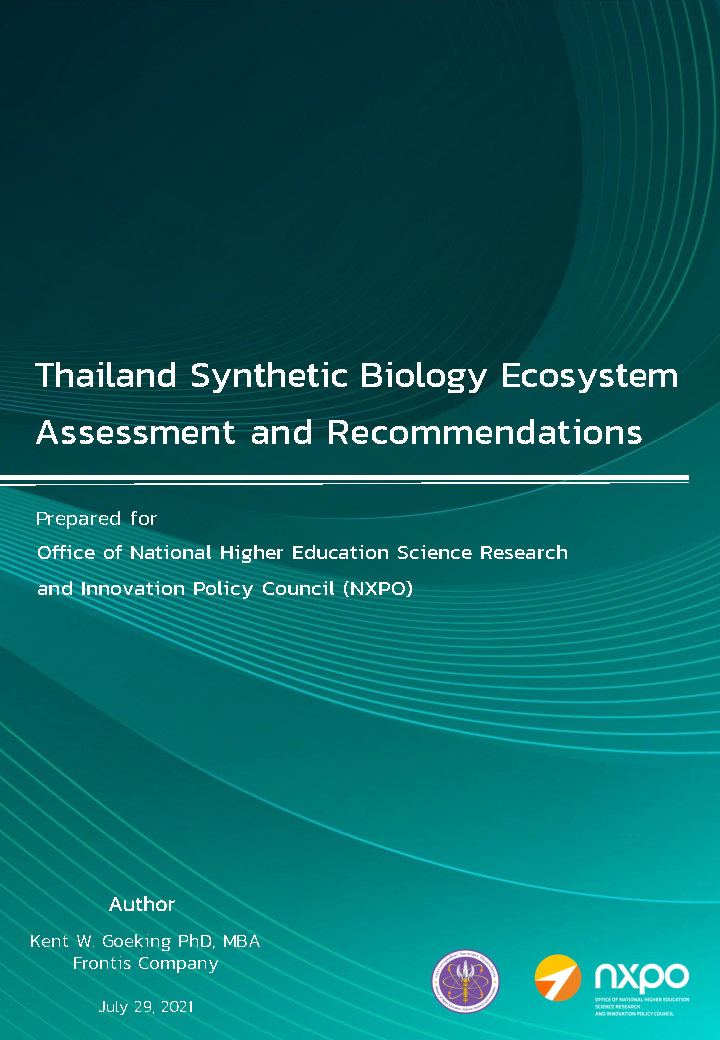 - รายงานการศึกษา เรื่อง Thailand Synthetic Biology Ecosystem Assessment and Recommendations โดย Kent W. Goeking นำเสนอรายละเอียดดังนี้ บทที่ 1. Introduction of core concepts บทที่ 2 Industries and applications บทที่ 3 Technical capabilities บทที่ 4 Comparative ecosystems บทที่ 5 Human resources บทที่ 6 Recommendations