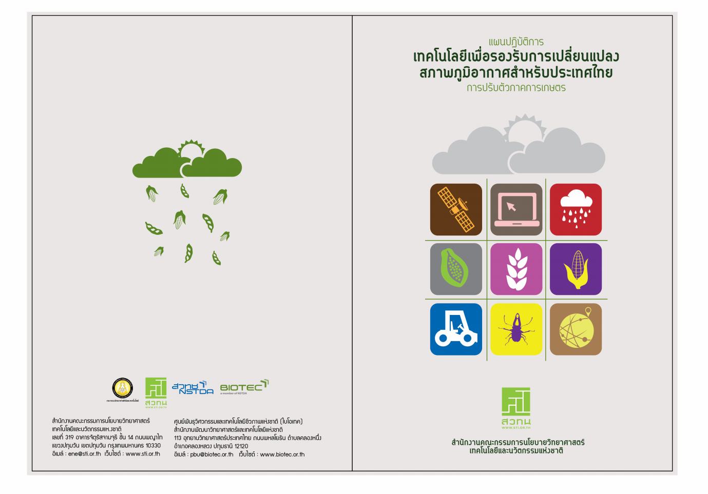 - สำนักงานคณะกรรมการนโยบายวิทยาศาสตร์ เทคโนโลยี และนวัตกรรมแห่งชาติ ร่วมศูนย์พันธุวิศวกรรมและเทคโนโลยีชีวภาพแห่งชาติ (ไบโอเทค) จัดทำแผนปฏิบัติการด้านเทคโนโลยีเพื่อรองรับการเปลี่ยนแปลงสภาพภูมิอากาศของประเทศไทย : การปรับตัวภาคการเกษตร ในการผลักดันและส่งเสริมให้ภาคการเกษตรของไทยมีการใช้เทคโนโลยี เพื่อสร้าง/เพิ่มความสามารถในการปรับตัวต่อการเปลี่ยนสภาพภูมิอากาศได้อย่างมีประสิทธิผล โดยนำเสนอรายละเอียด ดังนี้ บทที่ 1 ความเป็นมาและกรอบแนวคิดของการจัดทำแผนปฏิบัติการด้านเทคโนโลยี และวิธีการดำเนินงาน บทที่ 2 แผนปฏิบัติการด้านเทคโนโลยีเพื่อรองรับการเปลี่ยนแปลงสภาพภูมิอากาศของประเทศไทย บทที่ 3 แผนปฏิบัติการถ่ายทอดและขยายผลการใช้เทคโนโลยีสู่เกษตรกร