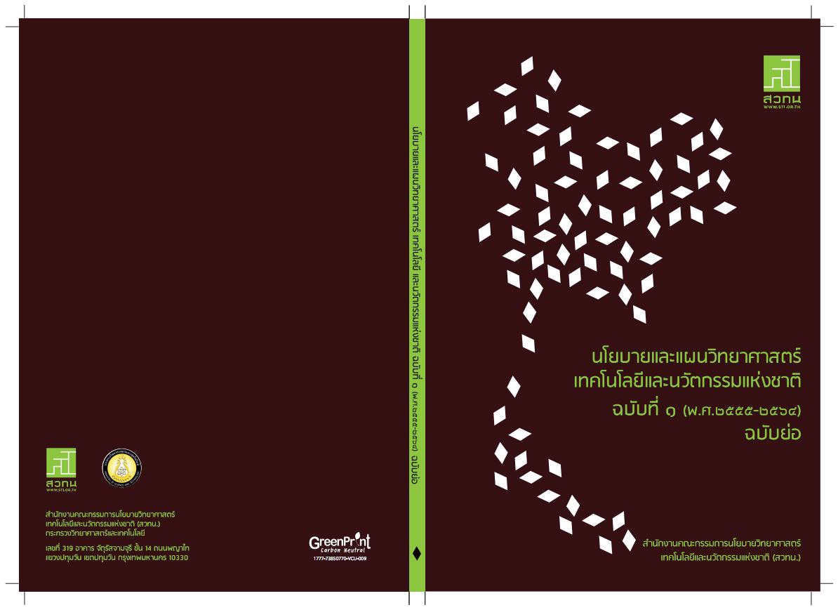 - นโยบายและแผนวิทยาศาสตร์ เทคโนโลยี และนวัตกรรมแห่งชาติ ฉบับที่ 1 (พ.ศ. 2555-2564) ฉบับย่อ จัดทำโดยสำนักงานคณะกรรมการนโยบายวิทยาศาสตร์ เทคโนโลยี และนวัตกรรมแห่งชาติ มีวัตถุประสงค์เพื่อการพัฒนาประเทศไทยให้มีระบบเศรษฐกิจที่มีการขยายตัวอย่างมีคุณภาพและมีเสถียรภาพ ตลอดจนมีการกระจายประโยชน์อย่างเป็นธรรมสู่สังคม ชุมชน ท้องถิ่น มีการนำปรัชญาของเศรษฐกิจพอเพียงมาเป็นปรัชญานำทางในการพัฒนาควบคู่ไปกับอนาคตของประเทศที่มีวิทยาศาสตร์ เทคโนโลยีและนวัตกรรมเป็นเครื่องมือช่วยพัฒนาประเทศไทย ซึ่งสอดรับกับทิศทางการพัฒนาประเทศของรัฐบาลที่ต้องการเห็นประเทศไทยสามารถแข่งขันได้อย่างยั่งยืน มีเศรษฐกิจชุมชนเข้มแข็งเป็นสังคมแห่งการเรียนรู้ และประชาชนมีคุณภาพชีวิตที่ดีขึ้น โดยได้กำหนดกรอบการพัฒนาของนโยบายและแผนฯ 5 ประการ คือ 1. พัฒนางานวิทยาศาสตร์ เทคโนโลยีและนวัตกรรมเพื่อสนับสนุนการสร้างสังคมคุณภาพที่มีภูมิคุ้มกัน 2. พัฒนางานวิทยาศาสตร์ เทคโนโลยีและนวัตกรรมเพื่อสนับสนุนการสร้างเศรษฐกิจให้มีคุณภาพเสถียรภาพโดยมีการเชื่อมโยงกับเศรษฐกิจโลกและภูมิ ภาค (Globalization and Regionalization) 3. พัฒนางานวิทยาศาสตร์ เทคโนโลยีและนวัตกรรมเพื่อรองรับการเปลี่ยนแปลงสภาพภูมิอากาศ (Climate Change) 4. พัฒนาและผลิตกำลังคนด้านวิทยาศาสตร์ เทคโนโลยีและนวัตกรรม เพื่อรองรับการเปลี่ยนแปลงประชากรศาสตร์ (Demographic Change) 5. พัฒนาปัจจัยสนับสนุนด้านโครงสร้างพื้นฐานวิทยาศาสตร์ เทคโนโลยีและนวัตกรรมเพื่อสนับสนุนการเพิ่มขีดความสามารถในการแข่งขันของประเทศ