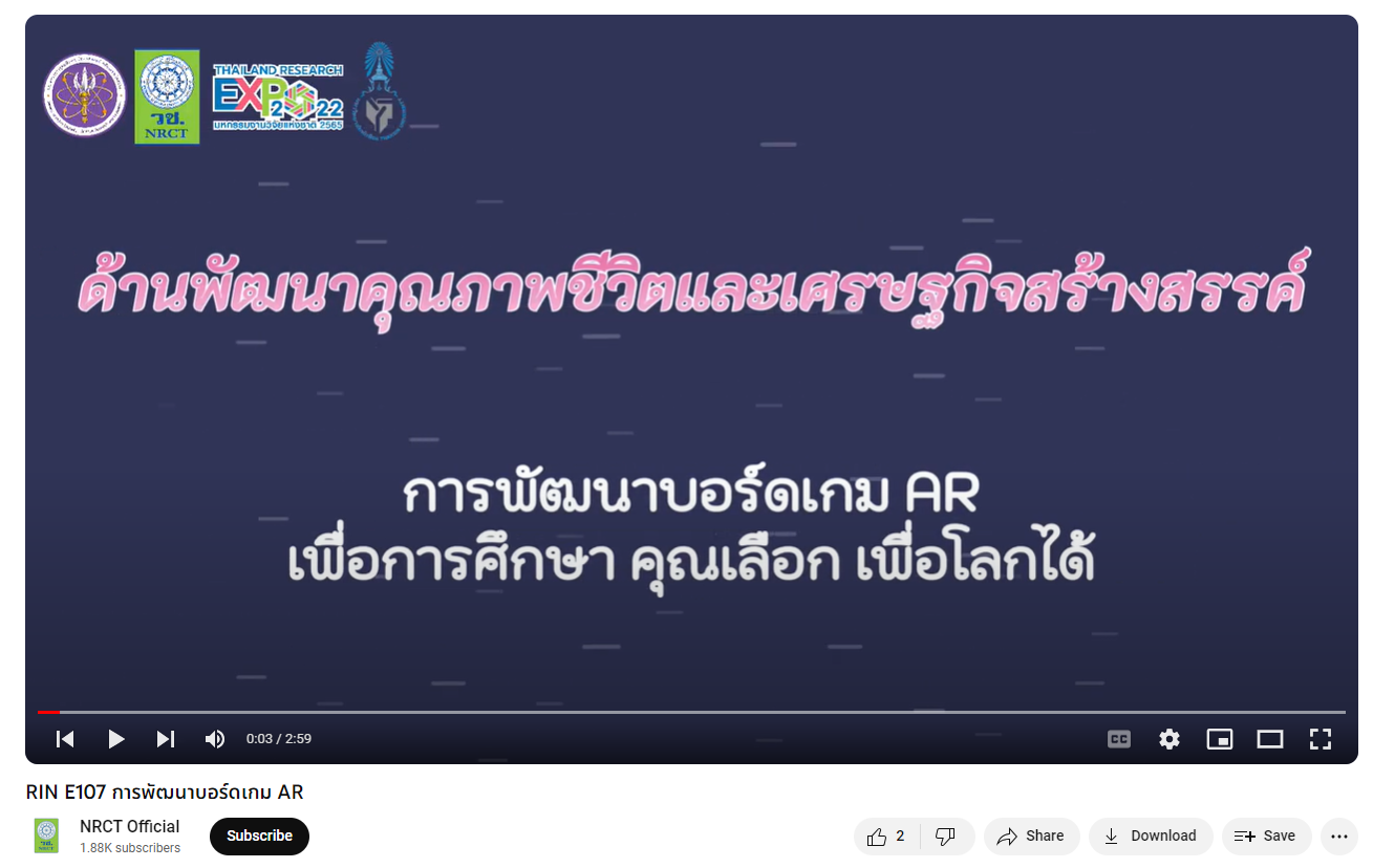 - ผลงานสายนวัตกรรมอุดมศึกษา ประจำปี 2565 ด้านการพัฒนาคุณภาพชีวิตและเศรษฐกิจสร้างสรรค์: การพัฒนาบอร์ดเกม AR