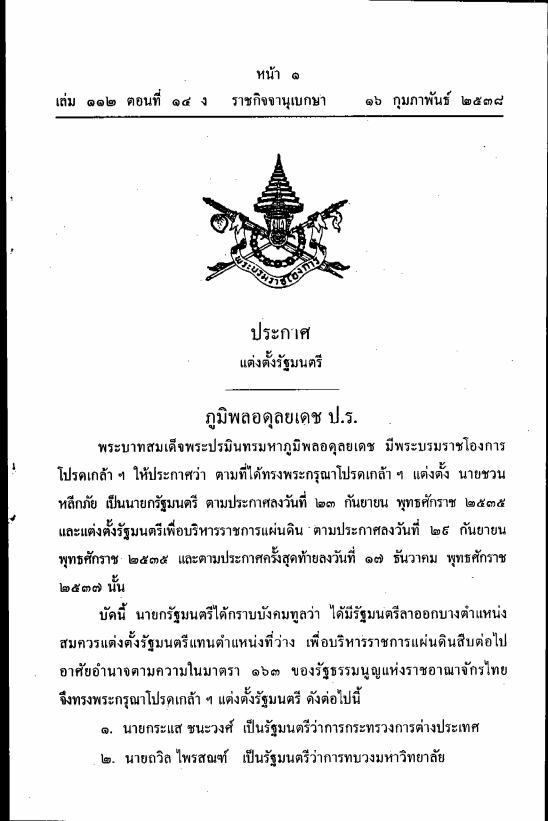 - ราชกิจจานุเบกษา เล่ม 112 ตอนที่ 14 ง ประกาศแต่งตั้งรัฐมนตรี เกี่ยวกับการแต่งตั้งรัฐมนตรีว่าการทบวงมหาวิทยาลัย-นายถวิล ไพรสณฑ์