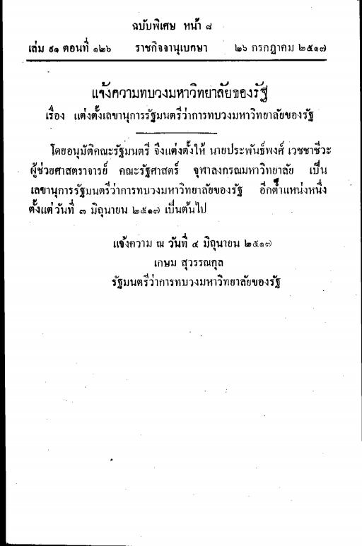 - ราชกิจจานุเบกษา เล่ม 91 ตอนที่ 126 ฉบับพิเศษ หน้า 8 เรื่องแต่งตั้งเลขานุการรัฐมนตรีว่าการทบวงมหาวิทยาลัยของรัฐเพิ่มเติม-นายประพันธ์พงศ์ เวชชาชีวะ