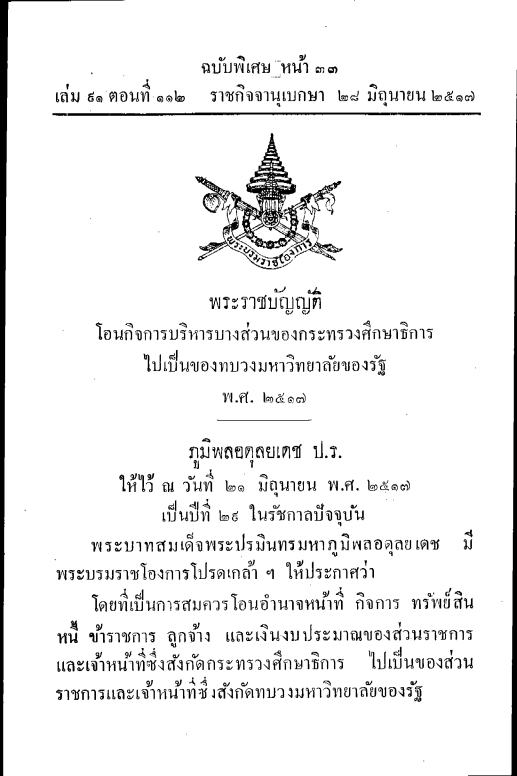 - พระราชบัญญัติ โอนกิจการบริหารบางส่วนของกระทรวงศึกษาธิการไปเป็นของทบวงมหาวิทยาลัยของรัฐ พ.ศ. 2517
