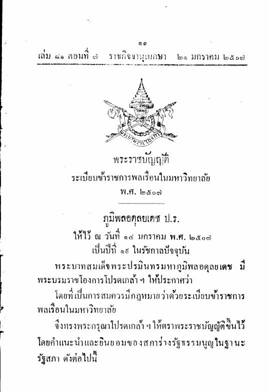 - ราชกิจจานุเบกษา เล่ม 81 ตอนที่ 7 หน้า 11-13 เรื่องพระราชบัญญัติระเบียบข้าราชการพลเรือนในมหาวิทยาลัย พ.ศ. 2507