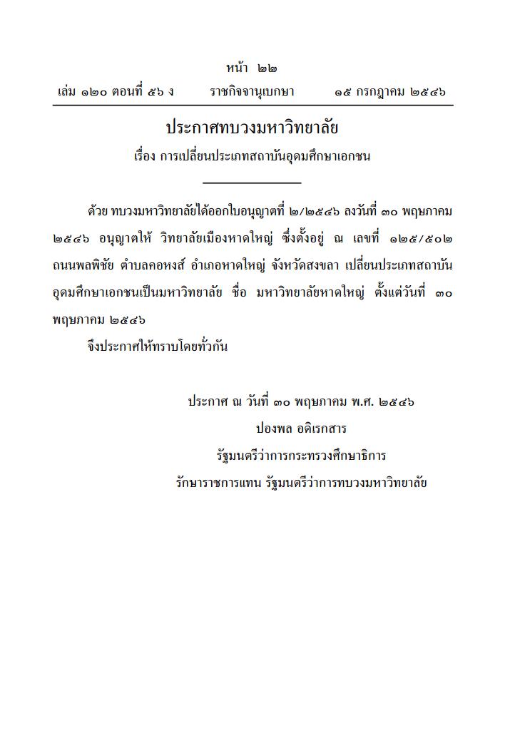 - ราชกิจจานุเบกษา เล่ม 120 ตอนที่ 56 ง หน้า 22 เรื่องการเปลี่ยนประเภทสถาบันอุดมศึกษาเอกชน จากวิทยาลัยเมืองหาดใหญ่ เป็น มหาวิทยาลัยหาดใหญ่ ประกาศ ณ วันที่ 30 พฤษภาคม 2546