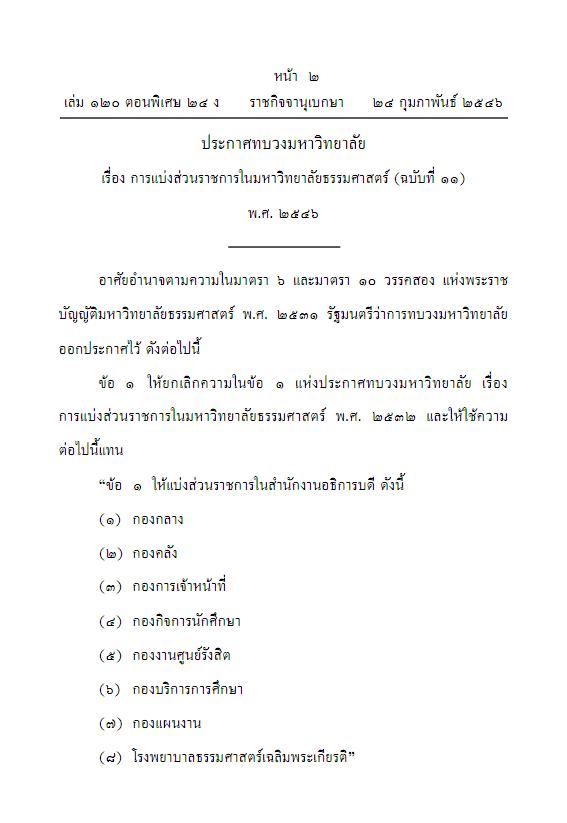 ประกาศทบวงมหาวิทยาลัย เรื่อง การแบ่งส่วนราชการในมหาวิทยาลัยธรรมศาสตร์ (ฉบับที่ 11) พ.ศ. 2546 แบ่งส่วนราชการในสำนักงานอธิการบดี