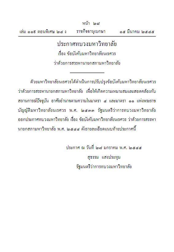 - ประกาศทบวงมหาวิทยาลัย เรื่อง ข้อบังคับมหาวิทยาลัยนเรศวร ว่าด้วย การสรรหานายกสภามหาวิทยาลัย