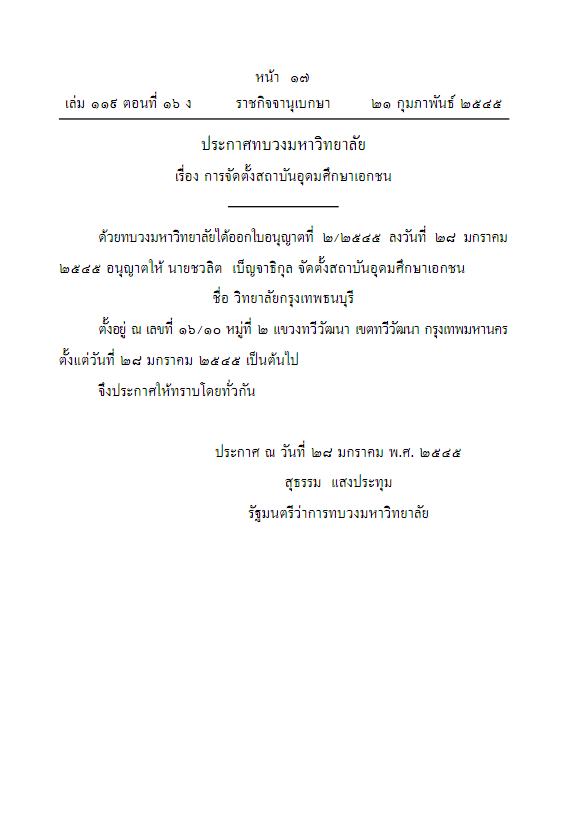 ประกาศทบวงมหาวิทยาลัย เรื่อง การจัดตั้งสถาบันอุดมศึกษาเอกชน : วิทยาลัยกรุงเทพธนบุรี