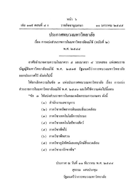 ประกาศทบวงมหาวิทยาลัย เรื่อง การแบ่งส่วนราชการในมหาวิทยาลัยแม่โจ้ (ฉบับที่ 2) พ.ศ. 2544
