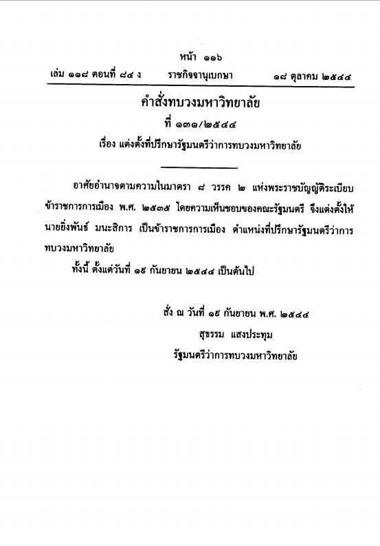 คำสั่งทบวงมหาวิทยาลัย ที่ 131/2544 เรื่อง แต่งตั้งที่ปรึกษารัฐมนตรีว่าการทบวงมหาวิทยาลัย -นายยิ่งพันธ์ มนะสิการ ดำรงตำแหน่งที่ปรึกษารัฐมนตรีว่าการทบวงมหาวิทยาลัย