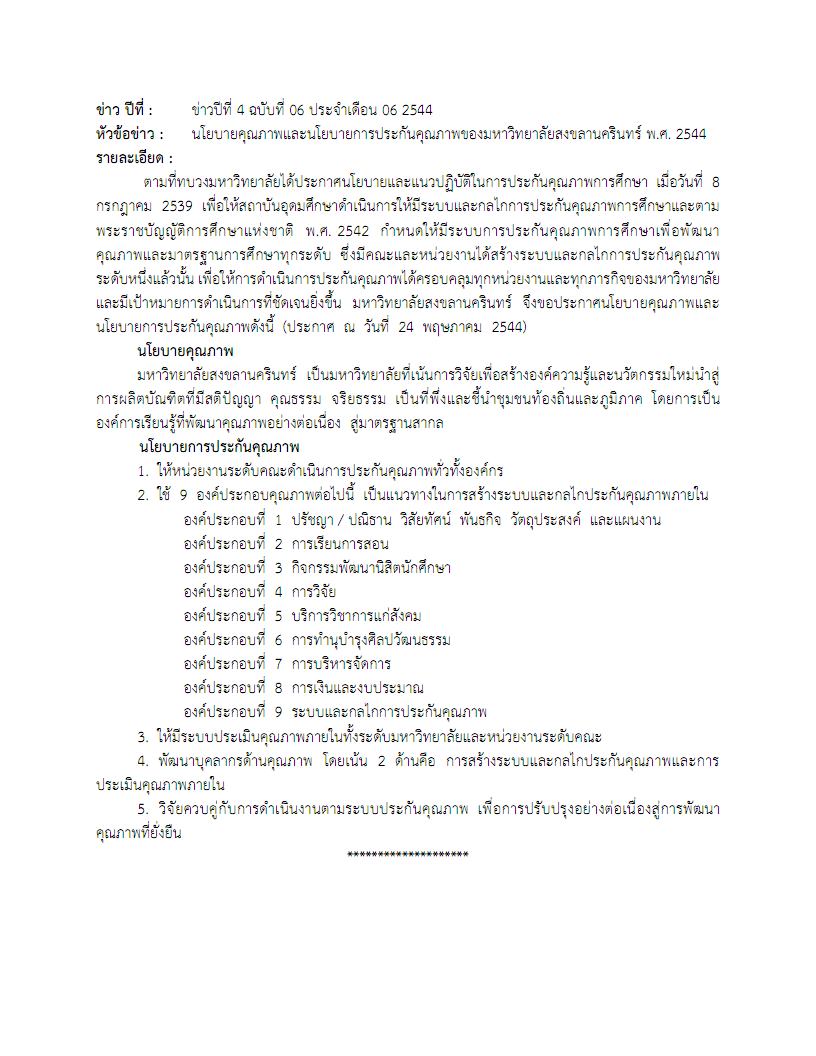 - ข่าวปีที่ 4 ฉบับที่ 06 ประจำเดือน 06 พ.ศ. 2544 เกี่ยวกับนโยบายคุณภาพและนโยบายการประกันคุณภาพของมหาวิทยาลัยสงขลานครินทร์ พ.ศ. 2544 ประกาศ ณ วันที่ 24 พฤษภาคม 2544