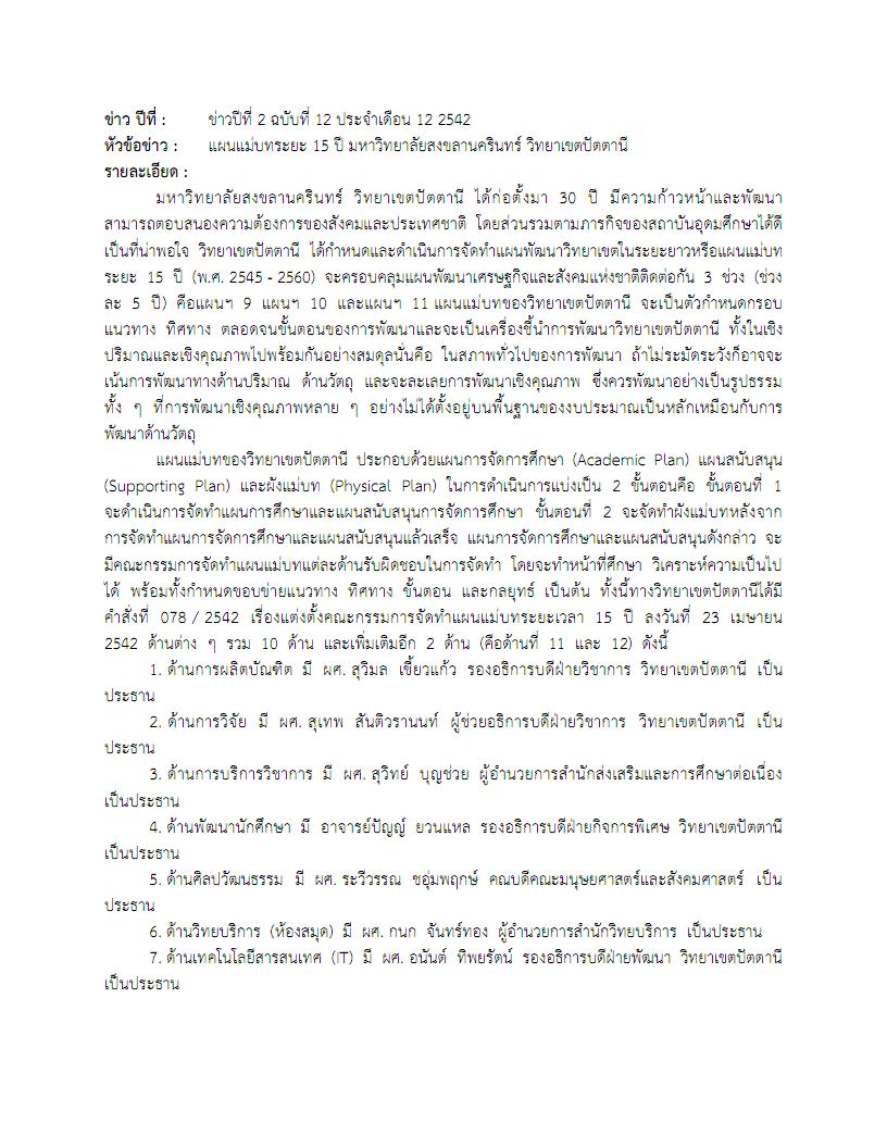 - ข่าวปีที่ 2 ฉบับที่ 12 ประจำเดือน 12 พ.ศ. 2542 เกี่ยวกับแผนแม่บทระยะ 15 ปี มหาวิทยาลัยสงขลานครินทร์ วิทยาเขตปัตตานี เพื่อความก้าวหน้าและพัฒนา สามารถตอบสนองความต้องการของสังคมและประเทศชาติ โดยแผนแม่บทของวิทยาเขตปัตตานี ประกอบด้วยแผนการจัดการศึกษา (Academic Plan) แผนสนับสนุน (Supporting Plan) และผังแม่บท (Physical Plan) ในการดำเนินการแบ่งเป็น 2 ขั้นตอนคือ ขั้นตอนที่ 1 จะดำเนินการจัดทำแผนการศึกษาและแผนสนับสนุนการจัดการศึกษา ขั้นตอนที่ 2 จะจัดทำผังแม่บทหลังจากการจัดทำแผนการจัดการศึกษาและแผนสนับสนุนแล้วเสร็จ แผนการจัดการศึกษาและแผนสนับสนุนดังกล่าว จะมีคณะกรรมการจัดทำแผนแม่บทแต่ละด้านรับผิดชอบในการจัดทำ โดยจะทำหน้าที่ศึกษา วิเคราะห์ความเป็นไปได้ พร้อมทั้งกำหนดขอบข่ายแนวทาง ทิศทาง ขั้นตอน และกลยุทธ์
