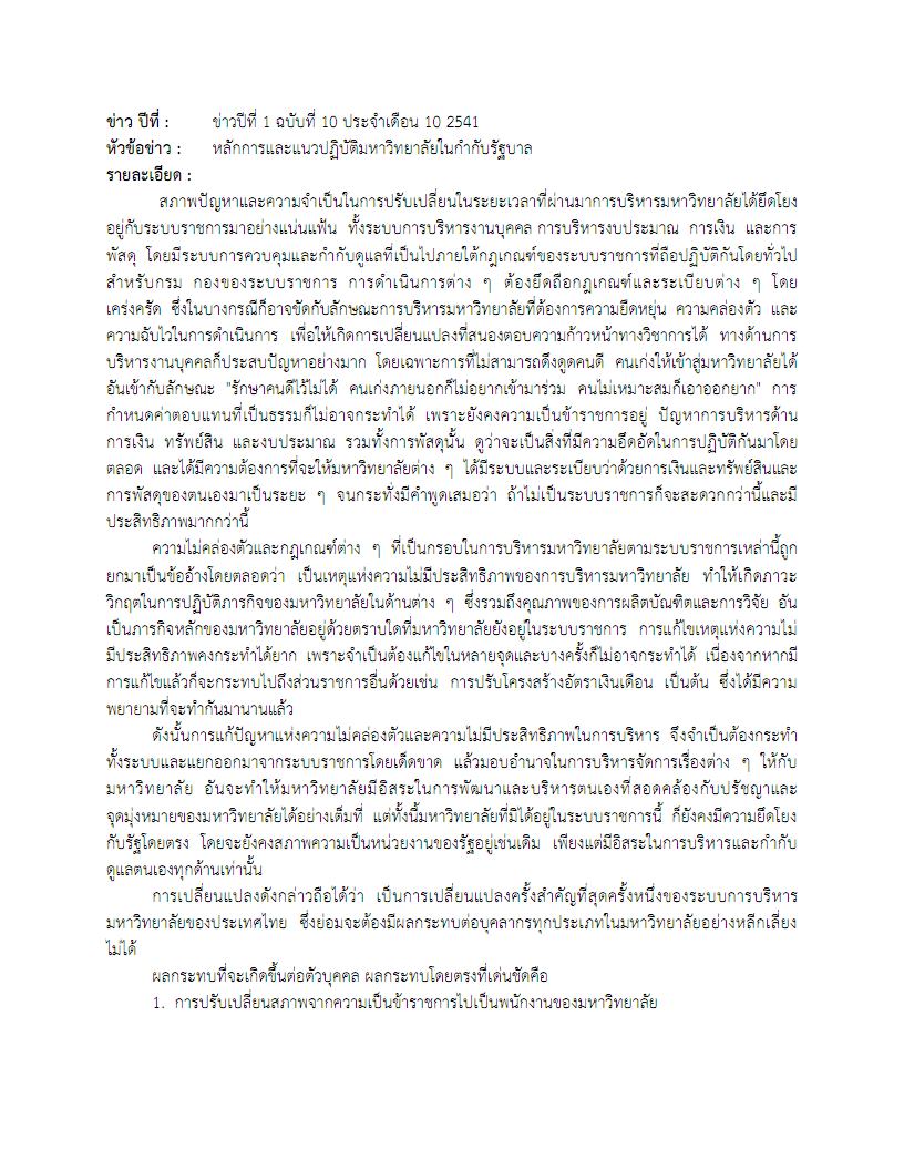 - ข่าวปีที่ 1 ฉบับที่ 10 ประจำเดือน 10 พ.ศ. 2541 เกี่ยวกับหลักการและแนวปฏิบัติมหาวิทยาลัยในกำกับรัฐบาล โดยสรุปได้ว่าการปรับเปลี่ยนสถานภาพของมหาวิทยาลัยไปสู่ความเป็นมหาวิทยาลัยในกำกับของรัฐบาลนั้น มีเป้าหมายเพื่อให้มหาวิทยาลัยสามารถกำกับดูแลตนเองได้โดยอิสระมากยิ่งขึ้น อันเป็นการสอดคล้องกับลักษณะของสถาบันอุดมศึกษาที่ต้องการความคล่องตัวและไวต่อการเปลี่ยนแปลงทางวิชาการ