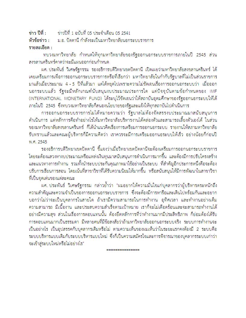 - ข่าวปีที่ 1 ฉบับที่ 05 ประจำเดือน 05 พ.ศ. 2541 เกี่ยวกับมหาวิทยาลัยสงขลานครินทร์ กำลังจะเป็นมหาวิทยาลัยนอกระบบราชการ โดยทบวงมหาวิทยาลัย กำหนดให้ทุกมหาวิทยาลัยของรัฐออกนอกระบบราชการภายในปี 2545 ส่วนสงขลานครินทร์คาดว่าจะมีแผนออกก่อนกำหนด ซึ่งรองอธิการบดีวิทยาเขตปัตตานี ชี้แจงเมื่อวิทยาเขตปัตตานีจะต้องเตรียมการออกนอกระบบราชการ โดยจะต้องแสวงหางบประมาณหรือแหล่งเงินทุนมาสนับสนุนการดำเนินการมากขึ้น และต้องมีการปรับโครงสร้างและแนวทางการทำงาน รวมทั้งนำระบบประกันคุณภาพมาใช้อย่างเป็นระบบ ที่สำคัญอีกประการหนึ่งคือจะต้องปรับการเรียนการสอน โดยเน้นที่สาขาวิชาที่ได้รับความนิยมให้มากขึ้น หรือสนับสนุนให้มีการพัฒนาในสาขาวิชาที่เป็นจุดเด่นของแต่ละคณะด้วย