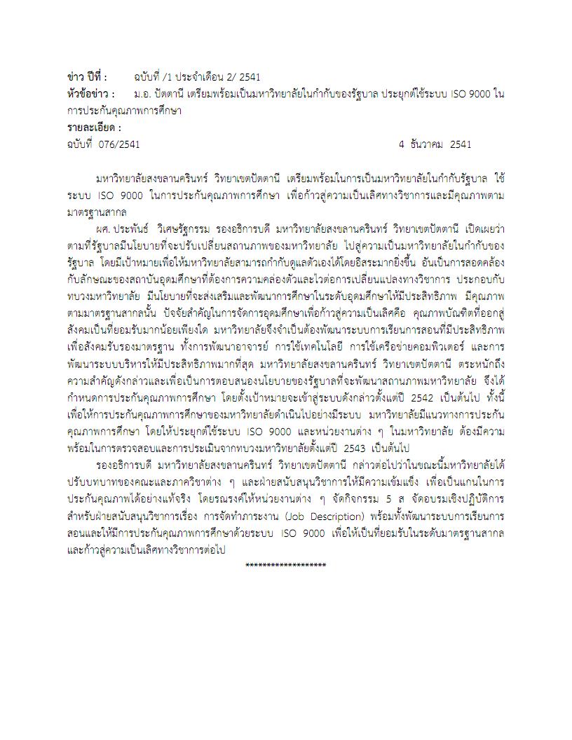 - ข่าวฉบับที่ 01 ประจำเดือน 02 พ.ศ. 2541 เกี่ยวมหาวิทยาลัยสงขลานครินทร์ วิทยาเขตปัตตานี เตรียมพร้อมเป็นมหาวิทยาลัยในกำกับของรัฐบาล ประยุกต์ใช้ระบบ ISO 9000 ในการประกันคุณภาพการศึกษา โดยการปรับบทบาทของคณะและภาควิชาต่าง ๆ และฝ่ายสนับสนุนวิชาการให้มีความเข้มแข็ง เพื่อเป็นแกนในการประกันคุณภาพได้อย่างแท้จริง โดยรณรงค์ให้หน่วยงานต่าง ๆ จัดกิจกรรม 5 ส จัดอบรมเชิงปฏิบัติการ สำหรับฝ่ายสนับสนุนวิชาการเรื่อง การจัดทำภาระงาน (Job Description) พร้อมทั้งพัฒนาระบบการเรียนการสอนและให้มีการประกันคุณภาพการศึกษาด้วยระบบ ISO 9000 เพื่อให้เป็นที่ยอมรับในระดับมาตรฐานสากลและก้าวสู่ความเป็นเลิศทางวิชาการต่อไป