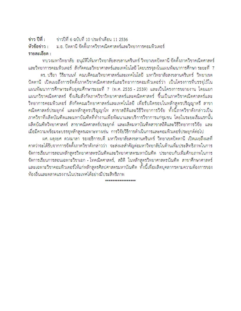 - ข่าวปีที่ 6 ฉบับที่ 10 ประจำเดือน 11 พ.ศ. 2536 เกี่ยวกับทบวงมหาวิทยาลัย อนุมัติให้มหาวิทยาลัยสงขลานครินทร์ วิทยาเขตปัตตานี จัดตั้งภาควิชาคณิตศาสตร์และวิทยาการคอมพิวเตอร์ สังกัดคณะวิทยาศาสตร์และเทคโนโลยี โดยบรรจุลงในแผนพัฒนาการศึกษา ระยะที่ 7