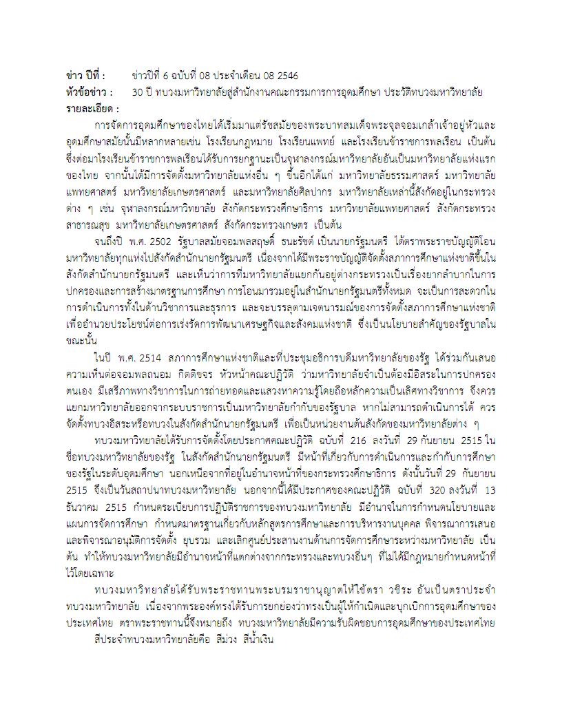 - ข่าวปีที่ 6 ฉบับที่ 08 ประจำเดือน 08 พ.ศ. 2546 เกี่ยวกับ เรื่องราว 30 ปี ของทบวงมหาวิทยาลัยสู่สำนักงานคณะกรรมการการอุดมศึกษา และประวัติทบวงมหาวิทยาลัย โดยการจัดระเบียบบริหารราชการในกระทรวงศึกษาธิการใหม่ มีองค์กรหลักที่เป็นคณะบุคคลในรูปสภาหรือในรูปคณะกรรมการ จำนวน 4 องค์กร ได้แก่ สภาการศึกษา คณะกรรมการการศึกษาขั้นพื้นฐาน คณะกรรมการการอาชีวศึกษา และคณะกรรมการการอุดมศึกษา เพื่อพิจารณาให้ความเห็นหรือให้คำแนะนำแก่รัฐมนตรีหรือคณะรัฐมนตรี และมีอำนาจหน้าที่อื่นตามที่กฎหมายกำหนดไว้