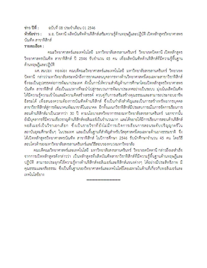 - ฉบับที่ 08 ประจำเดือน 01 พ.ศ. 2546 เกี่ยวกับคณะวิทยาศาสตร์และเทคโนโลยี มหาวิทยาลัยสงขลานครินทร์ วิทยาเขตปัตตานี เปิดหลักสูตรวิทยาศาสตรบัณฑิต สาขาฟิสิกส์ ปี 2546 รับจำนวน 45 คน เพื่อผลิตบัณฑิตด้านฟิสิกส์ที่มีความรู้พื้นฐานด้านทฤษฎีและปฏิบัติ สามารถประยุกต์ใช้ความรู้ทางด้านฟิสิกส์พอลิเมอร์และฟิสิกส์แขนงต่างๆ ได้อย่างมีประสิทธิภาพ มีคุณธรรมและจริยธรรม ซึ่งเป็นพื้นฐานของวิทยาศาสตร์และเทคโนโลยีโดยเฉพาะในด้านที่เกี่ยวกับพอลิเมอร์และเทคโนโลยียาง