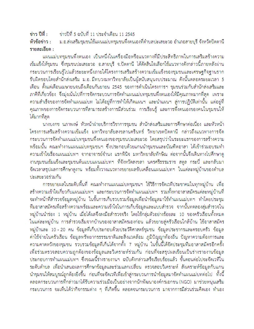 - ข่าวปีที่ 5 ฉบับที่ 11 ประจำเดือน 11 พ.ศ. 2545 เกี่ยวกับมหาวิทยาลัยสงขลานครินทร์ วิทยาเขตปัตตานี ส่งเสริมชุมชนใช้แผนแม่บทชุมชนพึ่งตนเองที่ตำบลปะเสยะวอ อำเภอสายบุรี จังหวัดปัตตานี ซึ่งแผนแม่บทชุมชนพึ่งตนเอง เป็นหนึ่งในเครื่องมือหรือแนวทางที่มีประสิทธิภาพในการเสริมสร้างความเข้มแข็งให้ชุมชน ซึ่งชุมชนปะเสยะวอ อ.สายบุรี จ.ปัตตานี ได้ตัดสินใจเลือกใช้แนวทางดังกล่าวนี้ภายหลังผ่านกระบวนการเรียนรู้ไปแล้วระยะหนึ่งภายใต้โครงการเสริมสร้างความเข้มแข็งของชุมชนและเศรษฐกิจฐานราก รับผิดชอบโดยสำนักส่งเสริม ม.อ. มีทบวงมหาวิทยาลัยเป็นผู้สนับสนุนงบประมาณ ดังนั้นตลอดระยะเวลา 5 เดือน ตั้งแต่เดือนเมษายนจนถึงเดือนกันยายน 2545 ของการดำเนินโครงการฯ ชุมชนร่วมกับสำนักส่งเสริมและภาคีที่เกี่ยวข้อง จึงมุ่งเน้นไปที่การจัดกระบวนการจัดทำแผนแม่บทชุมชนพึ่งตนเองให้มีคุณภาพมากที่สุด เพราะความสำเร็จของการจัดทำแผนแม่บท ไม่ได้อยู่ที่การทำให้เกิดแผนฯ และนำแผนฯ สู่การปฏิบัติเท่านั้น แต่อยู่ที่คุณภาพของการจัดกระบวนการที่สามารถสร้างการมีส่วนร่วม การเรียนรู้ และการพึ่งตนเองของคนในชุมชนให้ได้มากที่สุด
