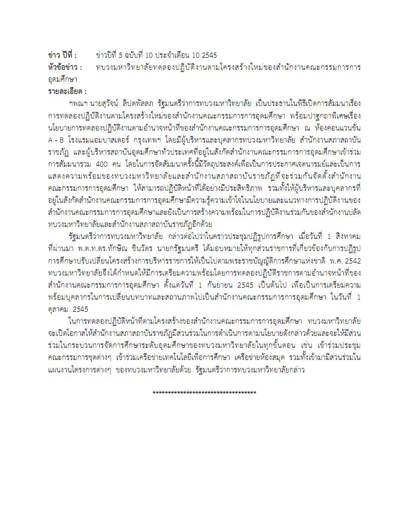 - ข่าวปีที่ 5 ฉบับที่ 10 ประจำเดือน 10 พ.ศ. 2545 เกี่ยวกับทบวงมหาวิทยาลัยทดลองปฏิบัติงานตามโครงสร้างใหม่ของสำนักงานคณะกรรมการการอุดมศึกษา โดยในการทดลองปฏิบัติหน้าที่ตามโครงสร้างของสำนักงานคณะกรรมการการอุดมศึกษา ทบวงมหาวิทยาลัยจะเปิดโอกาสให้สำนักงานสภาสถาบันราชภัฏมีส่วนร่วมในการดำเนินการตามนโยบาย และจะให้มีส่วนร่วมในกระบวนการจัดการศึกษาระดับอุดมศึกษาของทบวงมหาวิทยาลัยในทุกขั้นตอน เช่น เข้าร่วมประชุมคณะกรรมการชุดต่างๆ เข้าร่วมเครือข่ายเทคโนโลยีเพื่อการศึกษา เครือข่ายห้องสมุด รวมทั้งเข้ามามีส่วนร่วมในแผนงานโครงการต่างๆ ของทบวงมหาวิทยาลัยด้วย