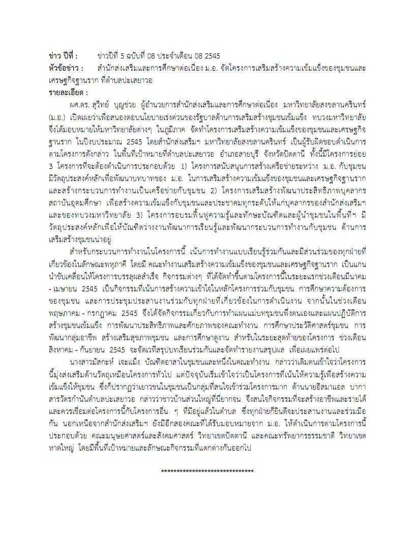 - ข่าวปีที่ 5 ฉบับที่ 08 ประจำเดือน 08 พ.ศ. 2545 เกี่ยวกับสำนักส่งเสริมและการศึกษาต่อเนื่อง ม.อ. จัดโครงการเสริมสร้างความเข้มแข็งของชุมชนและเศรษฐกิจฐานราก ที่ตำบลปะเสยาวอ เพื่อสนองตอบนโยบายเร่งด่วนของรัฐบาลด้านการเสริมสร้างชุมชนเข้มแข็ง โดยมีโครงการย่อย 3 โครงการที่จะต้องดำเนินการประกอบด้วย 1) โครงการสนับสนุนการสร้างเครือข่ายระหว่าง ม.อ. กับชุมชน มีวัตถุประสงค์หลักเพื่อพัฒนาบทบาทของ ม.อ. ในการเสริมสร้างความเข้มแข็งของชุมชนและเศรษฐกิจฐานราก และสร้างกระบวนการทำงานเป็นเครือข่ายกับชุมชน 2) โครงการเสริมสร้างพัฒนาประสิทธิภาพบุคลากรสถาบันอุดมศึกษา เพื่อสร้างความเข้มแข็งกับชุมชนและประชาคมทุกระดับให้แก่บุคลากรของสำนักส่งเสริมฯ และของทบวงมหาวิทยาลัย 3) โครงการอบรมฟื้นฟูความรู้และทักษะบัณฑิตและผู้นำชุมชนในพื้นที่ฯ มีวัตถุประสงค์หลักเพื่อให้บัณฑิตว่างงานพัฒนาการเรียนรู้และพัฒนากระบวนการทำงานกับชุมชน ด้านการเสริมสร้างชุมชนน่าอยู่