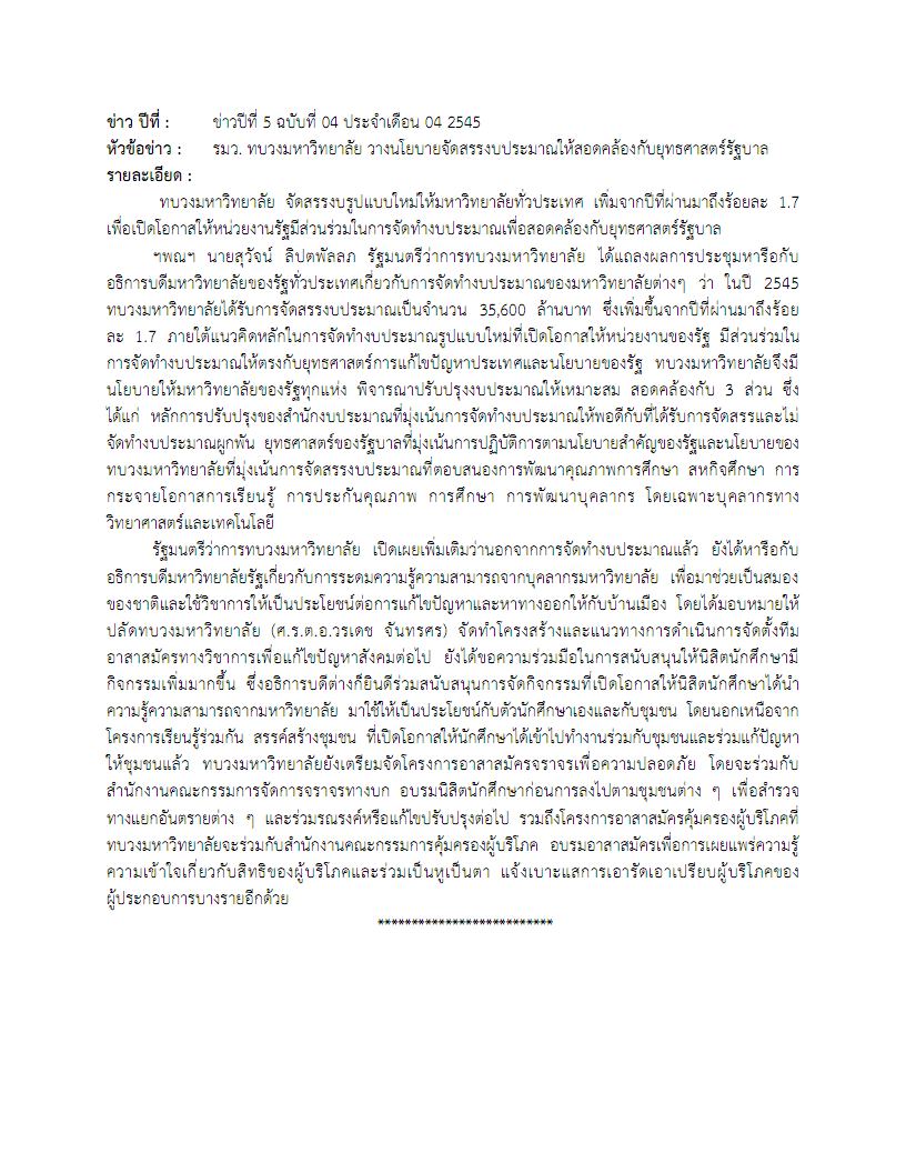 - ข่าวปีที่ 5 ฉบับที่ 04 ประจำเดือน 04 พ.ศ. 2545 เกี่ยวกับรมว. ทบวงมหาวิทยาลัย วางนโยบายจัดสรรงบประมาณให้สอดคล้องกับยุทธศาสตร์รัฐบาล ซึ่งทบวงมหาวิทยาลัย จัดสรรงบรูปแบบใหม่ให้มหาวิทยาลัยทั่วประเทศ เพิ่มจากปีที่ผ่านมาถึงร้อยละ 1.7 เพื่อเปิดโอกาสให้หน่วยงานรัฐมีส่วนร่วมในการจัดทำงบประมาณเพื่อสอดคล้องกับยุทธศาสตร์รัฐบาล