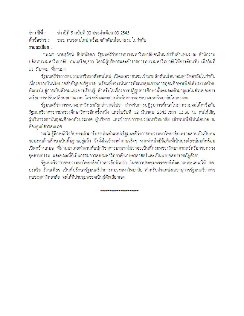 - ข่าวปีที่ 5 ฉบับที่ 03 ประจำเดือน 03 พ.ศ. 2545 เกี่ยวกับรัฐมนตรีว่าการทบวงมหาวิทยาลัยคนใหม่ ผลักดันนโยบายมหาวิทยาลัยในกำกับเนื่องจากเป็นนโยบายสำคัญของรัฐบาล พร้อมทั้งจะเน้นการพัฒนาคุณภาพการอุดมศึกษาเพื่อให้ประเทศไทยพัฒนาไปสู่การเป็นสังคมแห่งการเรียนรู้ สำหรับในเรื่องการปฏิรูปการศึกษานั้นตนจะเข้ามาดูแลในส่วนของการเตรียมการปรับเปลี่ยนสถานภาพ โครงสร้างและการดำเนินการของทบวงมหาวิทยาลัยในอนาคต