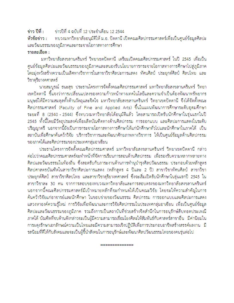 - ข่าวปีที่ 4 ฉบับที่ 12 ประจำเดือน 12 พ.ศ. 2544 เกี่ยวกับทบวงมหาวิทยาลัยอนุมัติให้ มหาวิทยาลัยสงขลานครินทร์ วิทยาเขตปัตตานี เปิดคณะศิลปกรรมศาสตร์ ในปี 2545 เพื่อเป็นศูนย์ข้อมูลศิลปะและวัฒนธรรมของภูมิภาคและสนองรับนโยบายการกระจายโอกาสทางการศึกษาไปสู่ภูมิภาค โดยมุ่งหวังสร้างความเป็นเลิศทางวิชาการในสาขาวิชาศิลปะการแสดง ทัศนศิลป์ ประยุกต์ศิลป์ ศิลปไทย และวิชาดุริยางคศาสตร์
