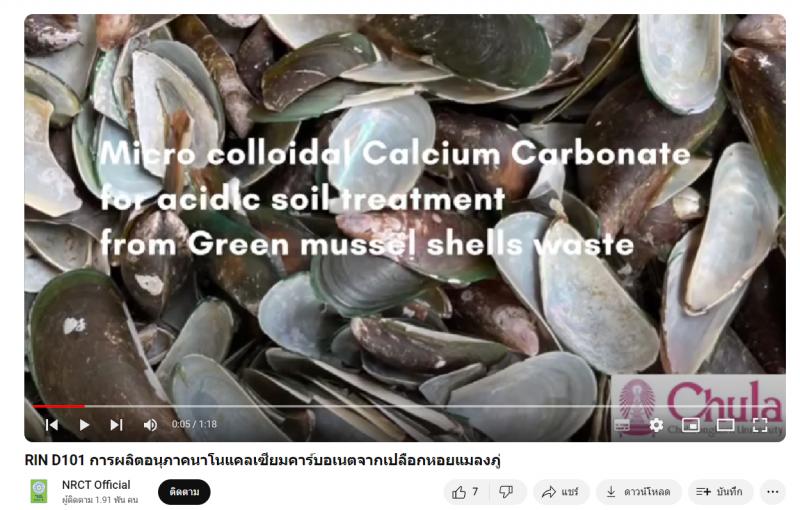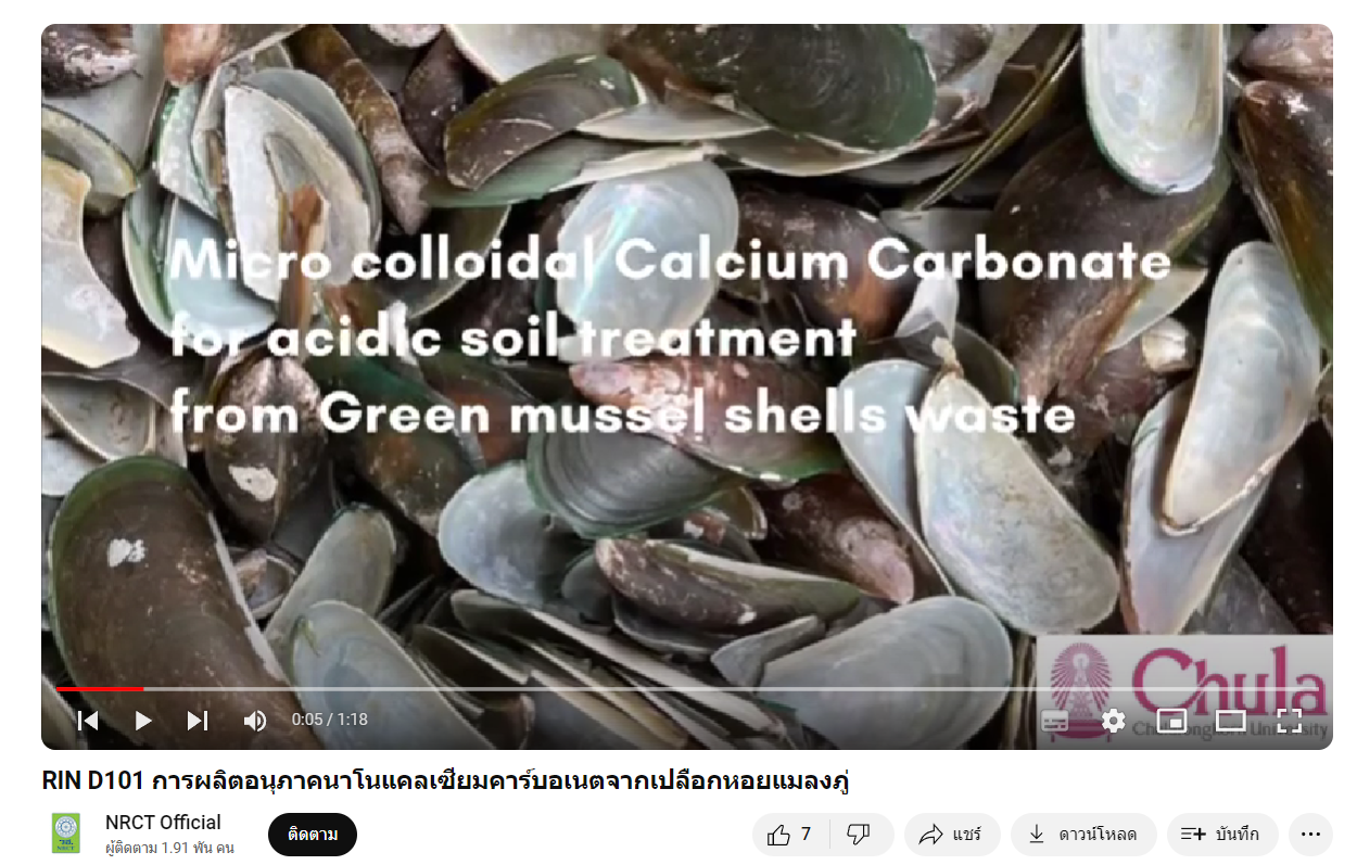 - ผลงานสายนวัตกรรมอุดมศึกษา ประจำปี 2565 ด้านพลังงาน สิ่งแวดล้อม และ BCG Economy Model: การผลิตอนุภาคนาโนแคลเซียมคาร์บอเนตจากเปลือกหอยแมลงภู่