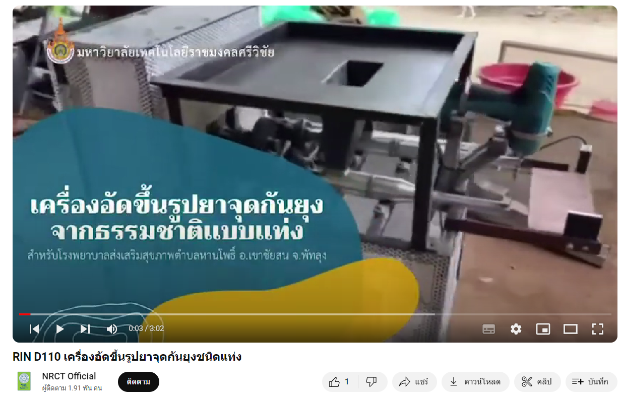 - ผลงานสายนวัตกรรมอุดมศึกษา ประจำปี 2565 ด้านพลังงาน สิ่งแวดล้อม และ BCG Economy Model: เครื่องอัดขึ้นรูปยาจุดกันยุงชนิดแท่ง