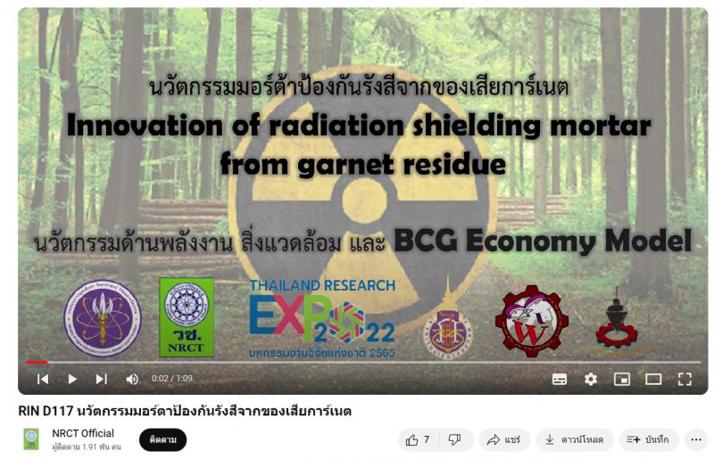 - ผลงานสายนวัตกรรมอุดมศึกษา ประจำปี 2565 ด้านพลังงาน สิ่งแวดล้อม และ BCG Economy Model: นวัตกรรมมอร์ตาป้องกันรังสีจากของเสียการ์เนต