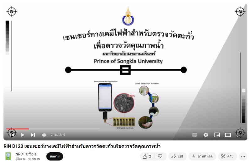 - ผลงานสายนวัตกรรมอุดมศึกษา ประจำปี 2565 ด้านพลังงาน สิ่งแวดล้อม และ BCG Economy Model: เซนเซอร์ทางเคมีไฟฟ้าสำหรับตรวจวัดตะกั่วเพื่อตรวจวัดคุณภาพน้ำ