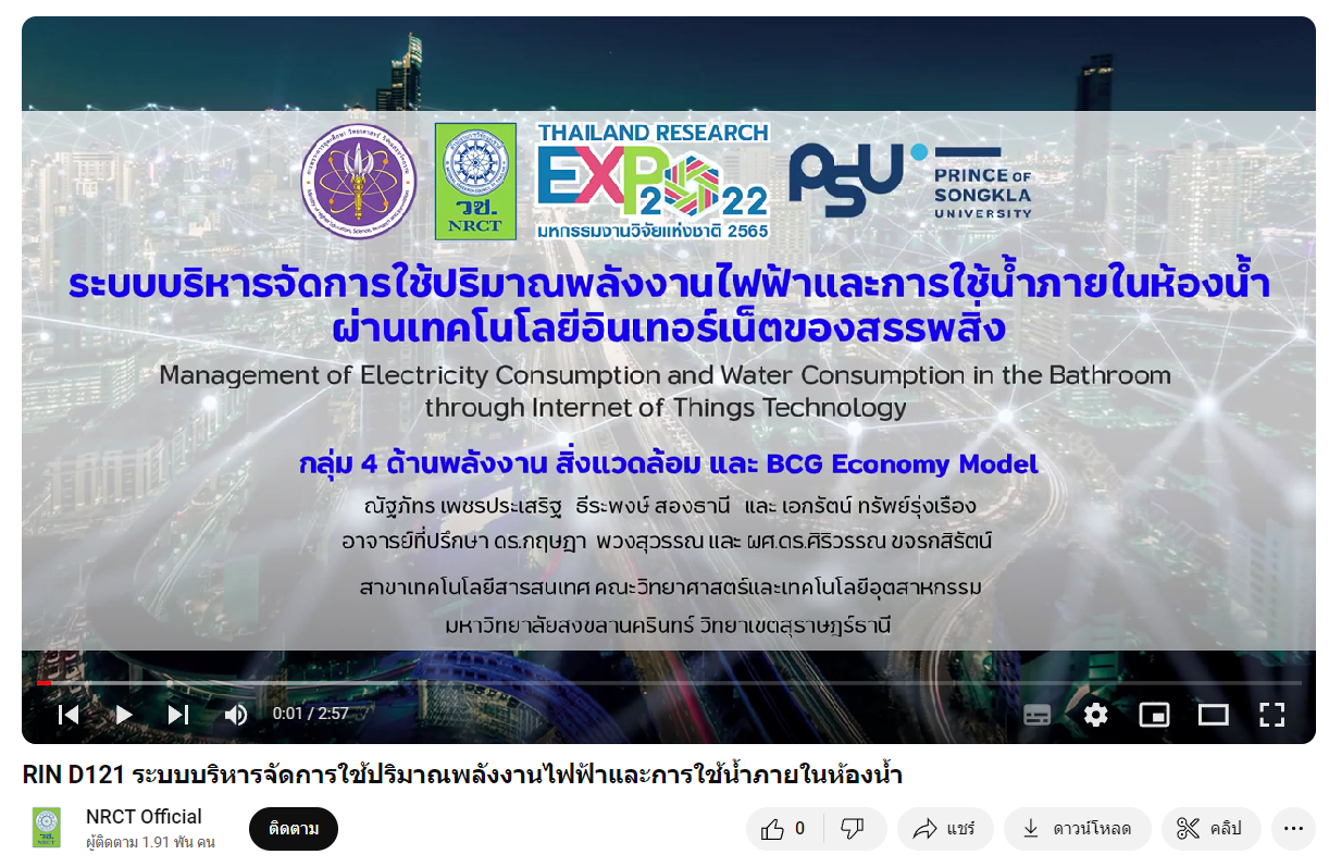 - ผลงานสายนวัตกรรมอุดมศึกษา ประจำปี 2565 ด้านพลังงาน สิ่งแวดล้อม และ BCG Economy Model: ระบบบริหารจัดการใช้ปริมาณพลังงานไฟฟ้าและการใช้น้ำภายในห้องน้ำ