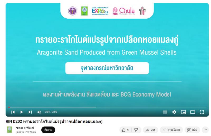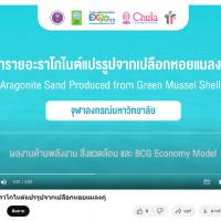- ผลงานสายนวัตกรรมอุดมศึกษา ประจำปี 2565 ด้านพลังงาน สิ่งแวดล้อม และ BCG Economy Model: ทรายอะราโกไนต์แปรรูปจากเปลือกหอยแมลงภู่