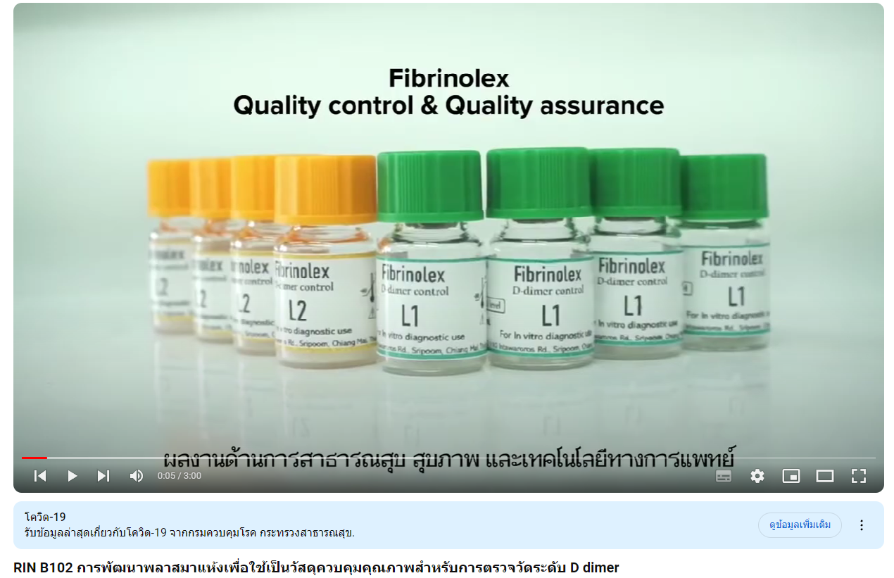 - ผลงานสายนวัตกรรมอุดมศึกษา ประจำปี 2565 ด้านการสาธารณสุข สุขภาพ และเทคโนโลยีทางการแพทย์: การพัฒนาพลาสมาแห้งเพื่อใช้เป็นวัสดุควบคุมคุณภาพสำหรับการตรวจวัดระดับ D dimer