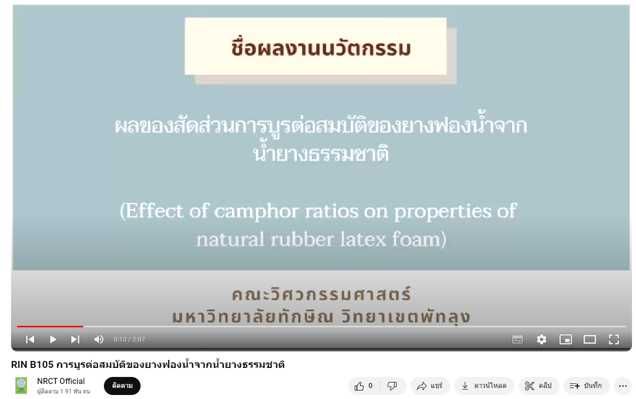 - ผลงานสายนวัตกรรมอุดมศึกษา ประจำปี 2565 ด้านการสาธารณสุข สุขภาพ และเทคโนโลยีทางการแพทย์: การบูรต่อสมบัติของยางฟองน้ำจากน้ำยางธรรมชาติ