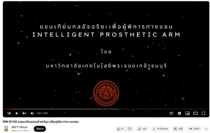 - ผลงานสายนวัตกรรมอุดมศึกษา ประจำปี 2565 ด้านการสาธารณสุข สุขภาพ และเทคโนโลยีทางการแพทย์: แขนเทียมกลอัจฉริยะเพื่อผู้พิการทางแขน