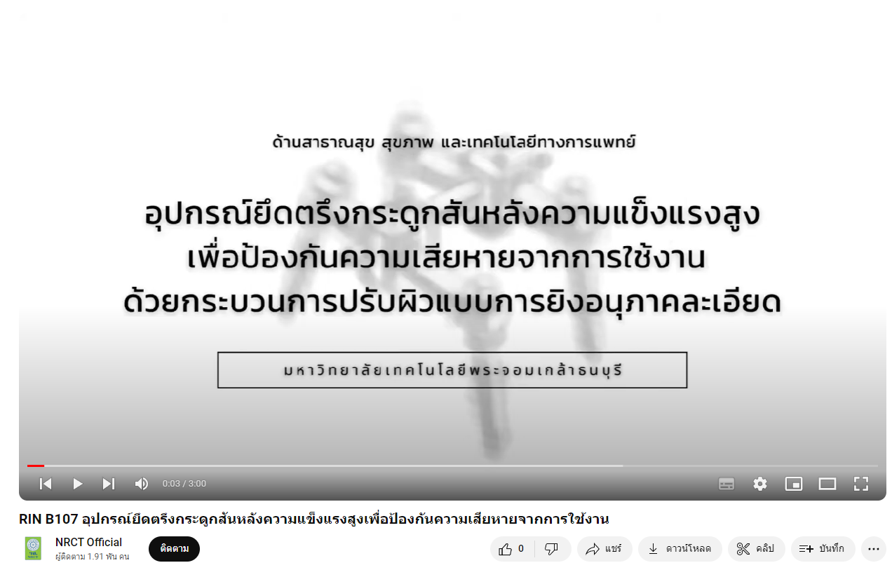 - ผลงานสายนวัตกรรมอุดมศึกษา ประจำปี 2565 ด้านการสาธารณสุข สุขภาพ และเทคโนโลยีทางการแพทย์: อุปกรณ์ยึดตรึงกระดูกสันหลังความแข็งแรงสูงเพื่อป้องกันความเสียหายจากการใช้งาน