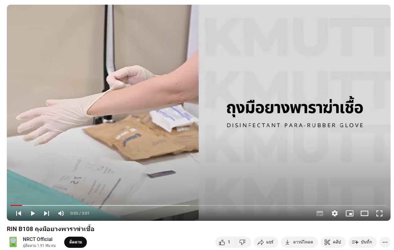 - ผลงานสายนวัตกรรมอุดมศึกษา ประจำปี 2565 ด้านการสาธารณสุข สุขภาพ และเทคโนโลยีทางการแพทย์: ถุงมือยางพาราฆ่าเชื้อ