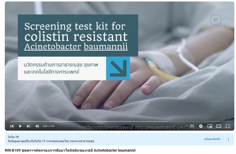 - ผลงานสายนวัตกรรมอุดมศึกษา ประจำปี 2565 ด้านการสาธารณสุข สุขภาพ และเทคโนโลยีทางการแพทย์: ชุดตรวจคัดกรองการดื้อยาโคลิสตินของเชื้อ Acinetobacter baumannii