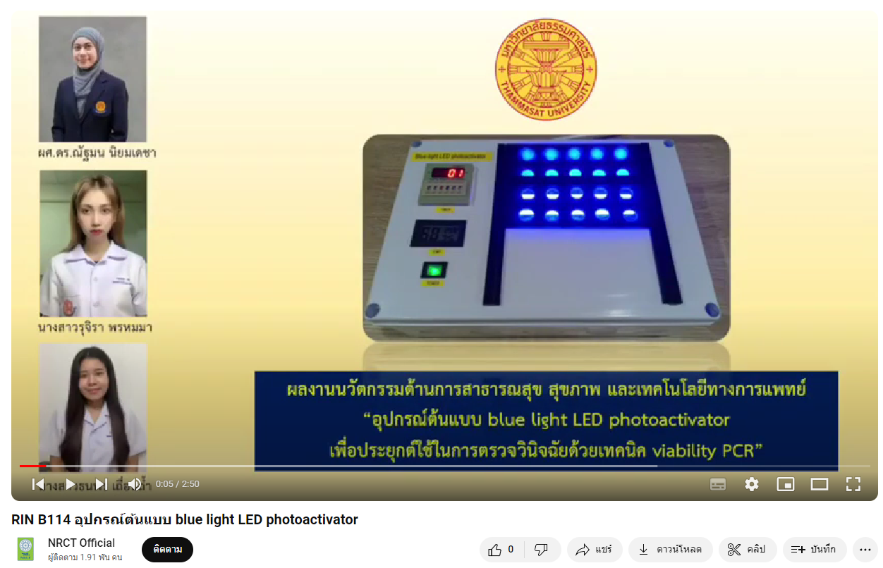 - อุปกรณ์ต้นแบบ blue light LED photoactivator เพื่อประยุกต์ใช้้ในการตรวจวินิจฉัยด้วยเทคนิค viability PCR