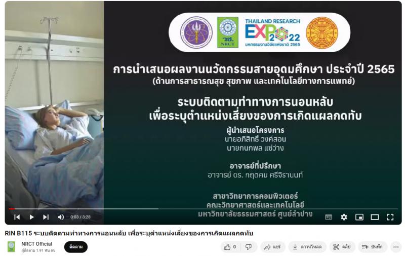 - ผลงานสายนวัตกรรมอุดมศึกษา ประจำปี 2565 ด้านการสาธารณสุข สุขภาพ และเทคโนโลยีทางการแพทย์: ระบบติดตามท่าทางการนอนหลับ เพื่อระบุตำแหน่งเสี่ยงของการเกิดแผลกดทับ
