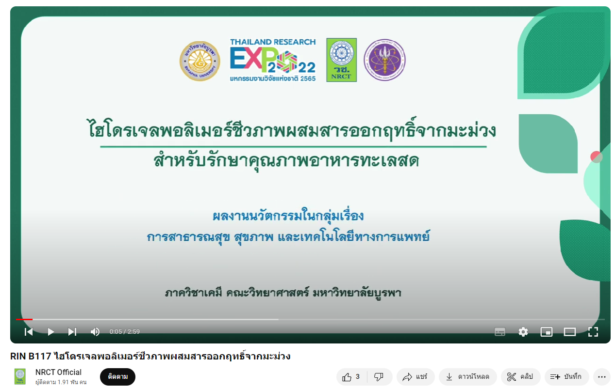 - ผลงานสายนวัตกรรมอุดมศึกษา ประจำปี 2565 ด้านการสาธารณสุข สุขภาพ และเทคโนโลยีทางการแพทย์: ไฮโดรเจลพอลิเมอร์ชีวภาพผสมสารออกฤทธิ์จากมะม่วง